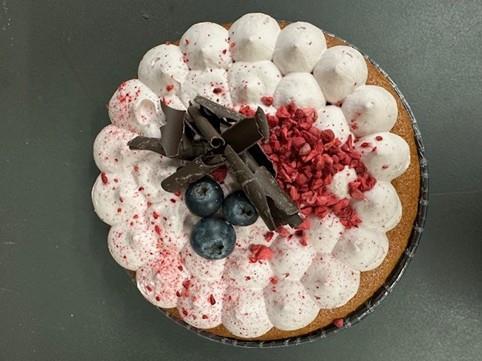 Sandkage bund med hindbærmousse og pynt (Pynten kan variere)